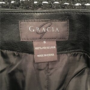 Gracia women skirt. Full zipper down the front of the skirt. Leather waist bank. Zippered pockets on front of skirt. Design in skirt. Dashes of silver and white threads throughout skirt.. Small kick pleat in back of skirt.