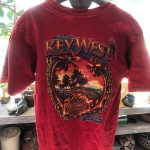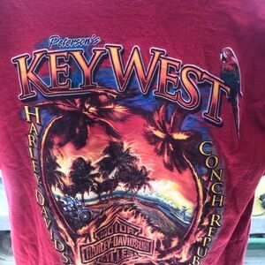 Bold red tee with Key West graphic. Harley-Davidson logo featured prominently. Comfortable short sleeves.