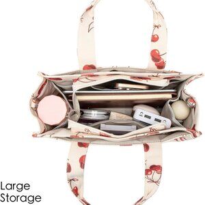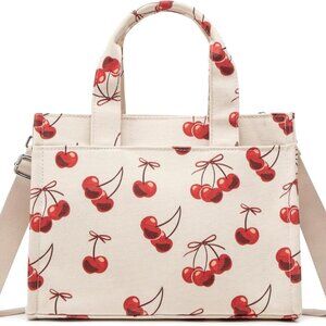 Features: This lightweight tote features a classic cherry print on durable canvas, combining a playful vibe with practical design. It offers a spacious main compartment with a zip closure and three interior pockets, perfect for staying organized. The bag can be carried by the top handle or worn crossbody with the detachable strap, giving you versatile styling options.