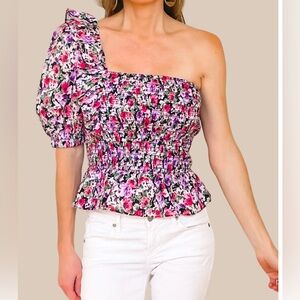 Elegant black top with intricate smocking. Long sleeves. High neckline.