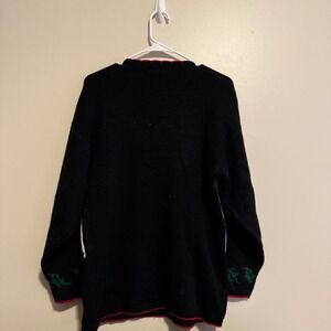 Keywords: Christmas sweater, ugly Christmas sweater, holiday sweater, vintage sweater, novelty sweater, ornament sweater, candy cane sweater, black sweater, red sweater, holiday party, retro Christmas, festive sweater, JJ Poole, small sweater