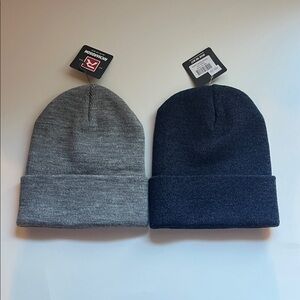 Pair of Hey Dude beanies. Features gray and dark blue colors. Cozy and fashionable.