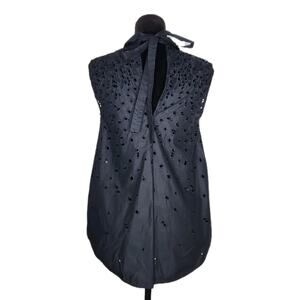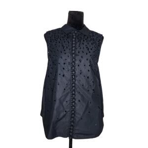 Proenza Schouler Black Eyelet Round Button Sheer Sleeveless Blouse Tie Back Sz 8