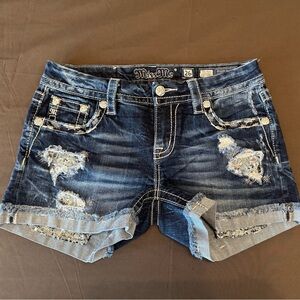 Stylish distressed denim shorts featuring American flag accents. Perfect for a casual look. Size 27