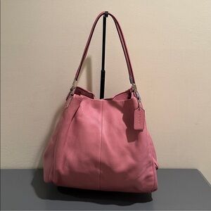 Stylish Coach shoulder bag with signature pattern. Features tan and brown tones. Perfect for everyday use.