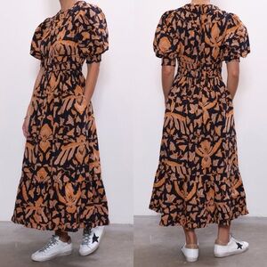 Embellished dress by Ganni. Brown color called Root Beer. Featuring an ornate beaded panel in the shape of a diamond. Open back design with side cutouts and adjustable ties. Made of 100% hemp. Hidden zipper on back. Midi length. Unlined. Ganni size 42 equals a US L. Missing a strand or two of beads, but it is not very noticeable since there are so many of them. In otherwise excellent condition!