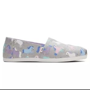 TOMS Alpargata Unicorn Stars Women's Shoes. Light Gray with unicorn print and glitter stars. Slip on. Rubber bottoms. New with tags and box