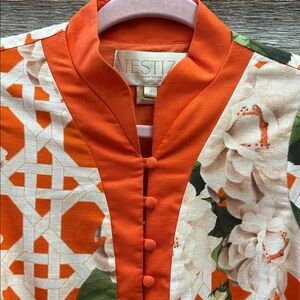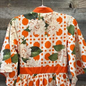 This beautiful dress features flare sleeves, and a button-up decorative front with a hidden side zipper. There are side pockets and it has a structured hem-line for shape. This is a linen, cotton blend and very soft. The dress is lined with an orange cotton liner. This is brand new with the tags still attached, and has no flaws. Measurements taken flat.