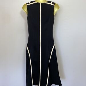 BY RAG & BONE HERE IS THEIR INCREDIBLE “ANDREA” DRESS. IT IS A TRIACETATE/POLY AND FULLY LINED. IT IS DONE IN MIDNIGHT BLUE WITH WHITE SIDE ACCENT LINES THAT GO OVER THE HIPS WITH ANOTHER WHITE ACCENT LINE IN BACK. THIS DARLING DRESS FEATURES A SCOOP NECK AND FRONT ZIP. IT IS SLEEVELESS AND FIT & FLARE STYLE. FABULOUS CONDITION! NWOT~ SZ 2~PLEASE NOTE THE MEASUREMENTS