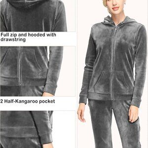 Features: Ultra soft and stretchy velour fabric makes this set super cozy and feels amazing on the skin. The full zip hoodie offers plush warmth with convenient kangaroo pockets, perfect for chilly mornings. The wide-leg sweatpants with an elastic waistband and drawstring provide a relaxed, flattering fit. Two slide pockets add extra convenience.