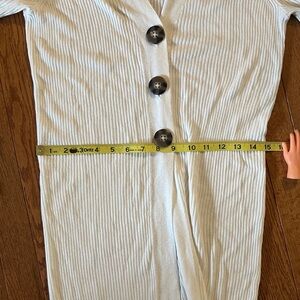Absolutely wonderful long ribbed ivory duster / cardigan / sweater / jumper. V-neck. Three brown buttons at front. Very stretchy and extremely comfortable. Great all season wearability. Versatile styling piece.