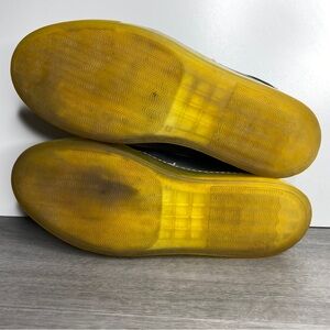 Good used condition. Has some heel drag and wear on soles. Yellowing on soles and tiny crack on front near stitching shown in close up. Some scuffs / distressing which might be intentional.