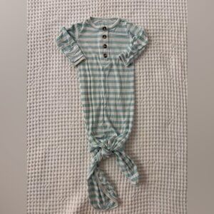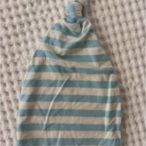 Washed (cold and hung to dry) but never worn. Light blue and white striped newborn bundle set with all pieces included. Knotted gown, hat, mitts, and swaddle blanket.