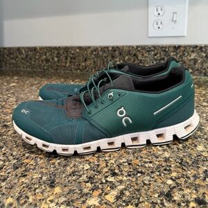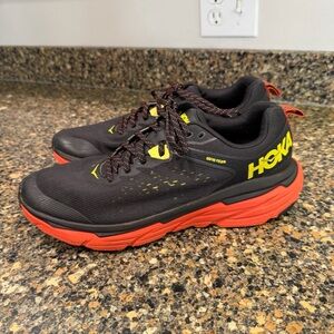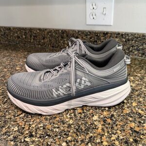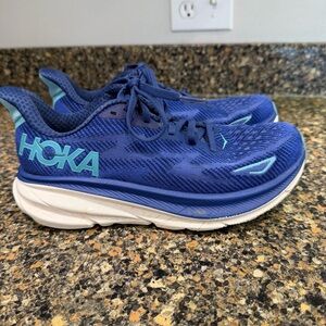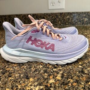 Stylish Hoka shoes with light blue upper and purple sole. Orange logo detail adds a pop of color. Size 8 1/2 clean and from a smoke free home nice preowned condition. Normal signs of usage. Please refer to all photos.