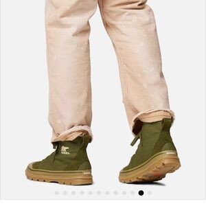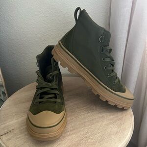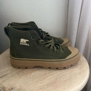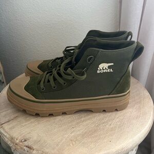 Female. Stylish green sneakers with durable tan sole. High-top design. Sorel branding on side. Size 10.5men / 11.5women