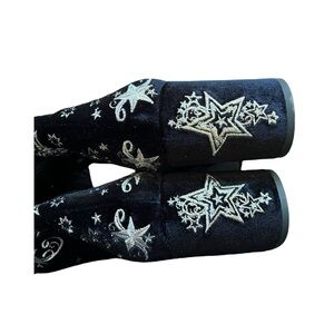 These baddie beauties come brand new with box and beautiful black velvet with metallic star embroidery design. Light scuffing on leather sole, was originally a floor model. 38 size equivalent to a US 7 1/2. Sits above knee at about half thigh, depending on leg length. Slightly tailored at ankle and calf for a snug fit that won’t easily slide down. Some mild stretch makes for easy pull on.