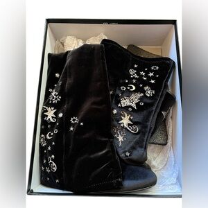 NWB Ash black velvet with metallic silver star embroidery knee-high block heel boots