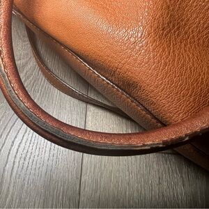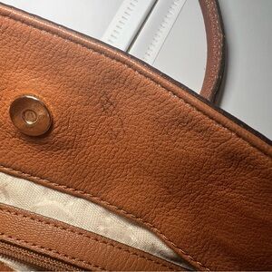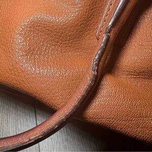 See pictures. The lock has a little wear and in some lighting you can see a couple stains on the front of purse. There’s pen marks inside.