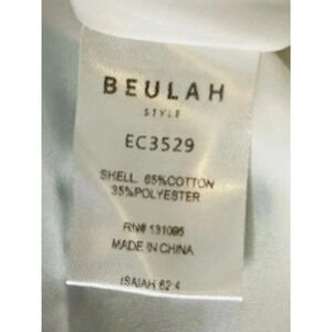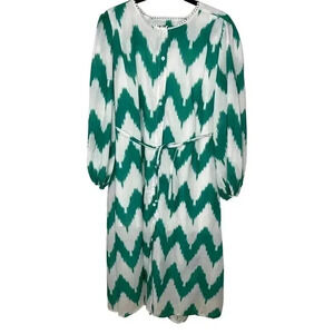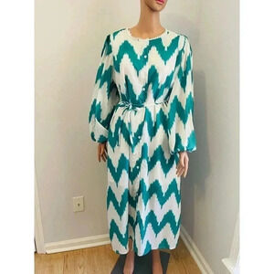 Beulah Style Charlotte Chevron Printed Midi Dress Green/White size L Brand: Beulah Style Size: Large Color: Green/ White Condition: Excellent pre-owned Abstract print fabric Side skirt slit lace detail Round neck Front button Waist tie Partially lined Approximate measurements Chest: 48” Waist: 54” Length: 49.5”