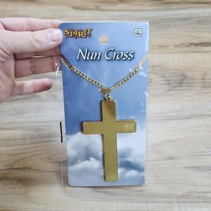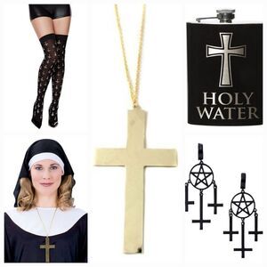 Includes gold-plated cross necklace, flask, stockings, and earrings Necklace: Cross Length 3.75" Width 2.25" The Power of Christ compels you this Halloween through this Cross Necklace! Ward off evil entities with this holy Gold-colored metal costume accessory. Serves as the perfect protection for a pious warrior in the Priest Adult Mens Costume. Flask: Length 5.5" Width 3.5" You'll be well hydrated and prepared to exorcise demons with this Holy Water Flask! An attached screw-on cap keeps the contents of this stainless steel flask secure whether you're busy fighting evil forces or just partying. Stockings: Take your Halloween costume to the next level when you get these Unholy Thigh High Stockings. Add an evil element to your look and get ready for the best Halloween yet! Earrings: Length 2.75" Complete your Halloween look with these unholy earrings! These black dangle earrings feature a pentagram and upside down crosses to let everyone know just how unholy you are. *No flaws noticed *Shipping weight 1 pound *Use code LOOKSFORLEADERS to sign up and receive $10 off your first purchase *Kitty friendly, non-smoking home *This is cross-listed on multiple sites *Don't delay purchasing, or you'll miss out *Discounts available for bundled orders *Same or next day shipping *Highly-rated seller