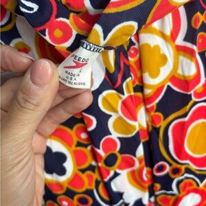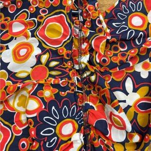 '70's retro floral hippie print all over in bold red, navy, yellow orange and white