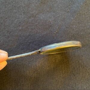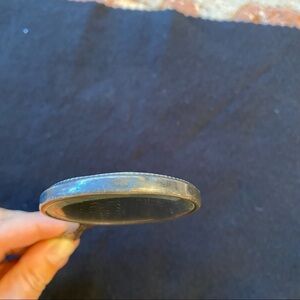 Small pewter purse mirror or decorative piece. Beautiful detail on the back of mirror and on both sides of the handle. Scratches on the mirror itself. Some imperfections in the rim of the metal on mirror. Measures a little more than 4.5 inches tall and 2 inches wide.