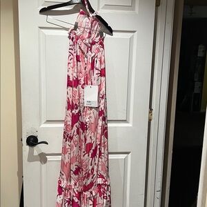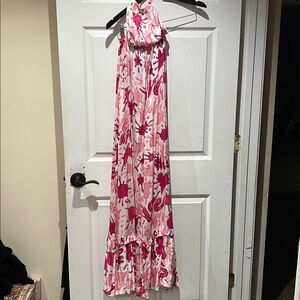 Chic Moschino maxi dress with vibrant pink and white floral design. Halter neckline adds elegance. Perfect for any occasion. If this does not sell it will go to a consignment store so make an offer