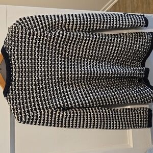 Chic cardigan with a black and cream knit pattern. Features front pockets and a classic design.