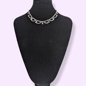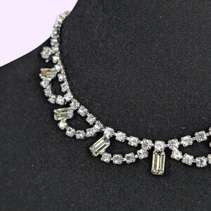 This vintage necklace is made of a silver tone metal and has an adjustable hook closure with a rhinestone at the end of the chain. The necklace features small white/clear rhinestones that are accented by darker (light grey) baguette-cut stones that fan out and away from the center. There are two stones that I can see that are closer to death than the others, but the rest seem fine. To see the two stones, look at the center of the first picture and count three stones over to the right. The slightly darker stone is #1, and the one directly below it is #2. It's very easy to miss if you're not looking for it, and the necklace is still very wearable.