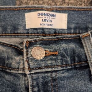 Casual and trendy Levi's boyfriend jeans. Features a relaxed fit and distressed accents. Ideal for everyday wear. Waist is 15", rise is 10.5", inseam is 25".
