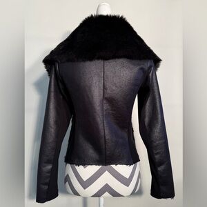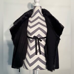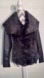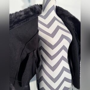 Mixed media coat, over sized fur collar and lapel, vegan embossed snakeskin leather with ribbed knit on sides and inside of sleeves for stretch. Asymmetrical zip interior tie. LO/HI hemline - longer front , side seam pockets.