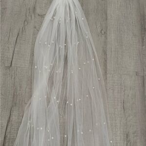 Add a touch of elegance to your look with this beautiful white hair veil adorned with delicate pearls. Perfect for a special occasion/wedding.