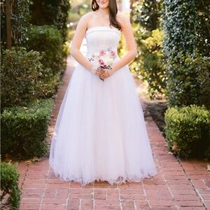 This dress is closely sparkling and such a gorgeous blush pink color. Hard to describe how beautiful it is in person! Elegant off-shoulder design. Layered lace with floral details.