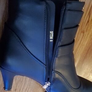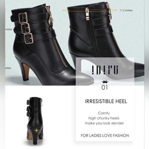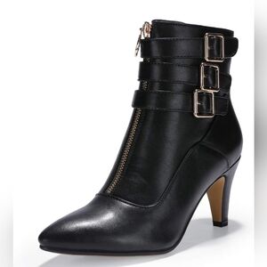 Elevate your wardrobe with these chic black heeled boots. Featuring stylish buckle accents, they offer both elegance and comfort for any occasion.