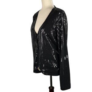 Like new! This stunning black sequin blazer from Tulle adds instant glamour to any outfit. With its subtle stretch, sleek hook-and-eye front closures, and full lining for comfort, it’s the perfect piece for parties, concerts, or a festive night out.