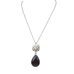 IZCO & CO. gold tone necklace featuring a unique square link charm above a polished teardrop pendant. The pendant is a deep reddish-brown hue with subtle striations reminiscent of natural stone. This versatile necklace is ideal for adding a touch of elegance to everyday outfits or for completing a polished look for a dinner date.