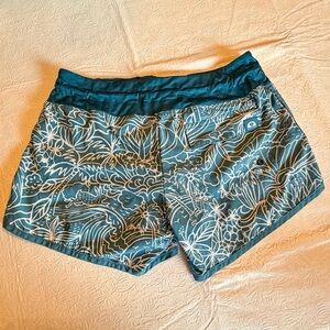 Stay active in style with these blue floral athletic shorts with a drawstring and flap over a zippered back pocket. Ideal for workouts or casual outings.