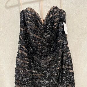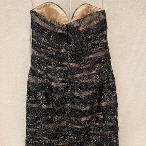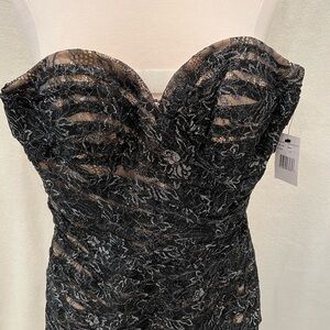 Elegant vintage black strapless dress with sweetheart neckline. Fitted silhouette. Ruched black floral lace with silver metallic highlights on nude base, boning throughout bodice. Built in padding at chest, back hidden seam zip. No known flaws. Measurements: Bust- 34, Waist- 29.