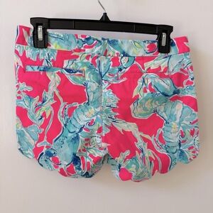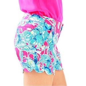 Add a pop of color to your warm-weather wardrobe with these vibrant Lilly Pulitzer Buttercup Scallop Hem Shorts! These iconic shorts feature a bold hot pink and seafoam green tropical crab print with charming scalloped hems and side slits for a flattering fit. Designed with front slash pockets, back welt pockets, and a gold logo button for that signature Lilly touch, these shorts are equal parts playful and polished. Perfect for beach getaways, poolside lounging, or casual summer brunches.