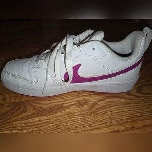 Stylish Nike sneakers for kids. White base with pink accents. Comfortable and durable design.