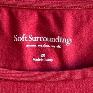 Soft Surroundings red round neckline 3/4-sleeve top, size 2X. Good preowned condition. Cotton-modal-spandex blend fabric. Soft and comfortable.