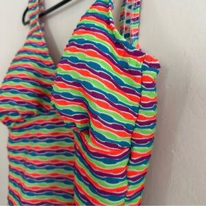 Vintage 90s One Piece Swimsuit Fluorescent Neon Size L/XL Stripes Textured fabric Low Back with sewn-in padding, low cut on hips for more coverage