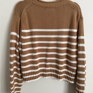 Chic camel and white stripes. Soft knit fabric. Ideal for layering. 100% cotton sweater with classic j crew rollneck.