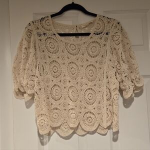 Trendy cropped crochet design with scalloped edge. Comes in a beautiful cream color. Perfect for a feminine addition to your closet!