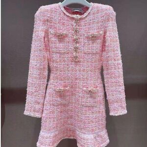 Chic mini dress by House of CB. Cream base with pink floral pattern. Long flared sleeves. Sweetheart neckline with tie detail.
