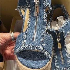 Stylish denim blue espadrille wedges by Michael Kors. Features frayed edges and a comfortable platform.