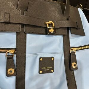 Crafted in durable, lightweight nylon with black leather trim, gold-tone hardware, and the signature Bendel details. Features include two front zip pockets, a top flap with belt and lock accent, and spacious interior perfect for travel, work, or everyday use.