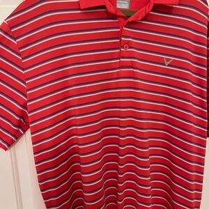 Callaway Stylish and comfortable, this red striped polo shirt is perfect for any casual occasion. Enjoy the soft fabric and classic design. Size XL. 90% polyester and 10% spandex. Machine wash cold.