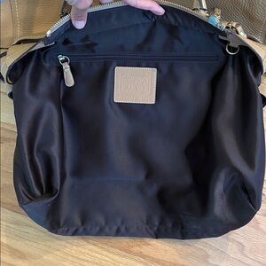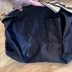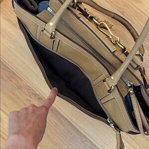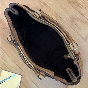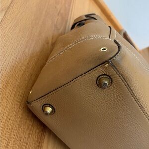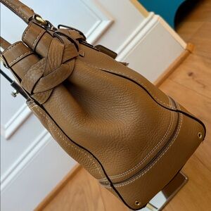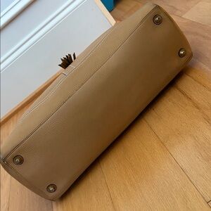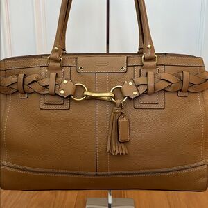 This is a beautiful large vintage coach handbag with stunning people leather. The hardware is gold in color. On the front it features a tassel with the classic leather coach hang tag. In the back is a large zipper pocket. The main part zipper is closed. Inside is a few slip pockets and on the opposite side is a zipper pocket. The coach creed is inside. There is also a D ring to hang your keys. The inside is extremely clean! What's unique about this bag is on each side is a snap so you can open it for a little extra room. When measuring the top from left to right it's approximately 15 1/2 inches across at the top. The bottom is approximately 16" x 5 1/2". At the widest part the bag is about 18 1/2 inches across. The bag is approximately 11 inches tall. It features gold toned hardware that shows minimal wear. There is a few marks to the leather mainly on the bottom corners and bottom of the bag. The metal feet show tarnishing. The bag was stuffed for photos. Don't let this collectible bag get away!. Inventory 34