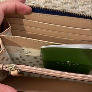 Gorgeous royal blue Kate Spade wallet for sale, perfect condition never been used. Wallet has 2 sides for cards, a zipper section, and another section for cash. Inside is cream with tan polka dots. Accented with gold zippers and hardware.